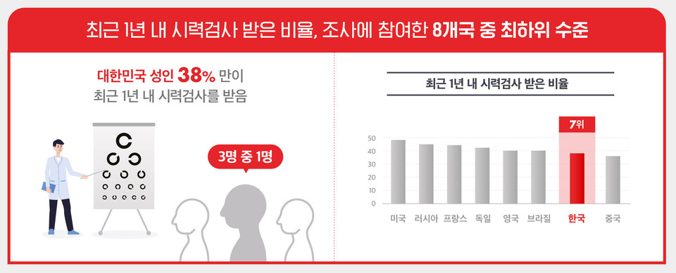 한국존슨앤드존슨 비젼(대표 이정현)이 세계 시력의 날을 맞아 8개국의 만18세 이상 남녀 1만6034명을 대상으로 진행한 '눈 건강 및 시력검사에 대한 인식조사('Prioritize Your Eyes)'설문조사 결과를 공유했다. 설문조사 결과 한국은 조사국가인 8개국 중에서 '최근 1년내 시력검사를 받은 비율'을 묻는 질문에 7위인 최하위권을 기록했다. 순위는 미국, 러시아, 프랑스, 독일, 영국, 브라질 순이며 8위는 중국이다.