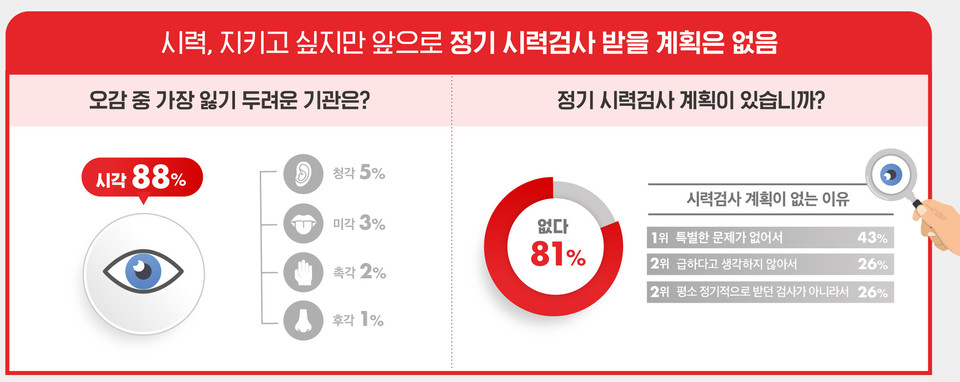 대부분의 안 전문가들은 잘 보이는 것과 별개로 주기적인 시력검사를 받을 것을 권유하고 있다. 안경이나 콘택트렌즈를 착용하지 않더라도 검사가 필요한데 우리나라는 시력검사에 대한 인식이 낮은 것으로 나타났다. 최근 1년 내 시력검사를 받은 경험이 있다고 답한 비율은 38%다. 1위인 미국은 48%이며 러시아, 프랑스, 독일 역시 40%를 웃돌고 있다.