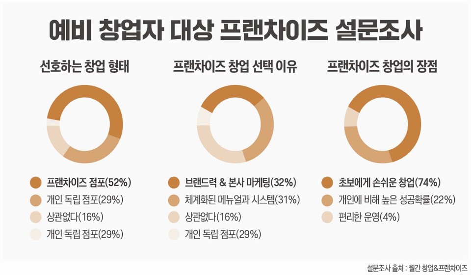 코로나가 유행하기 이전부터 대한민국의 안경 업계에서는 각기 다른 콘셉트와 운영방식을 바탕으로 다양한 프랜차이즈들이 주류를 이루고 있었다. 물론 독립적인 개인 안경원으로써 지역 내 영향력을 발휘하며 운영하는 곳도 다수 존재 하지만 적지 않은 사람들은 점포 운영 경험이 많지 않기 때문에 프랜차이즈로 시작하는 경우가 많다. 실제로 예비 창업자들을 대상으로 진행됐던 설문조사에서는 선호하는 창업 형태로 프랜차이즈가(52%) 압도적으로 높았던 것을 볼 수 있다. 프랜차이즈를 선호하는 이유로는 브랜드력과 본사 마케팅(32%), 체계화된 매뉴얼과 운영 시스템(31%), 점포 운영 경험 부족(30%) 등인데 이는 대다수 프랜차이즈들이 가지고 있는 장점들 중 하나다.