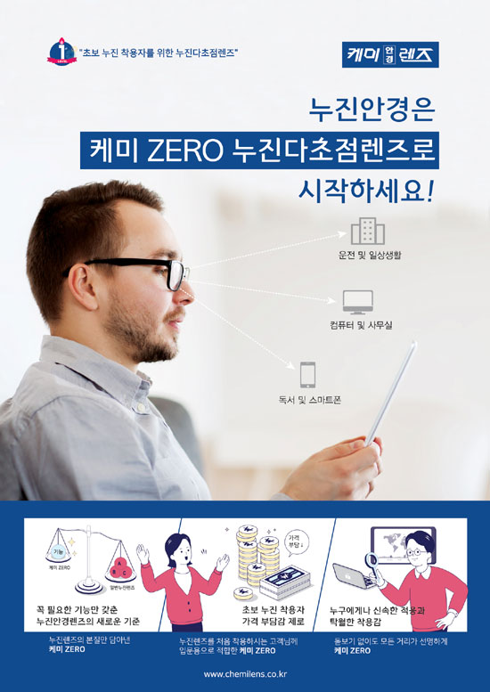 케미렌즈가 선보인 '케미 제로'와 데코비전의 '니덱 NF-FIRST' 렌즈는 근거리 시야 불편함을 완화해주는 입문형 누진안경렌즈다. 높은 컴퓨터 사용량으로 안구를 조절하는 힘이 부족해 근거리 시야 장애가 발생하기 쉬운 30~40대 사무직 근로자에게 적합하다. '케미 매직폼 모바일 오피스' 렌즈도 실내 전용 누진안경렌즈로 사무용에 적합하다.