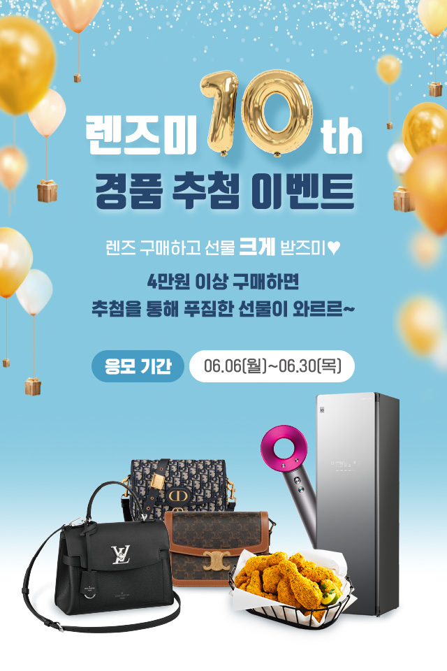 렌즈미에서 4만원 이상 구매고객에게 응모권을 증정하는데 추첨을 통해 명품가방과 스타일러, D사의 헤어드라이어, 치킨 기프티콘 등이며 총 31명을 추첨한다. 당첨자는 이벤트가 종료된 후 공식 홈페이지를 통해 공개하게 된다. 창립 10주년을 기념하기 위해 진행되는 의미있는 이벤트인 만큼 제세공과금까지 가맹점에 일절 부담을 주지 않고 렌즈미 본사에서 100% 지원할 계획이다.