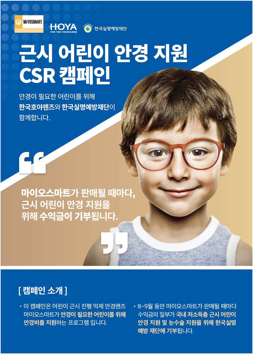활동의 일환으로 8월에서 9월 동안 전국 150여 곳 안경원에서 한국호야렌즈의 어린이 근시 진행 억제 안경렌즈 마이오 스마트가 판매될 때마다 수익금의 일부가 기부금으로 적립되며, 마련된 기부금은 한국실명예방재단에 전달돼 저소득층 근시 어린이 안경 지원 및 눈 수술비 지원을 위해 쓰일 예정이다.