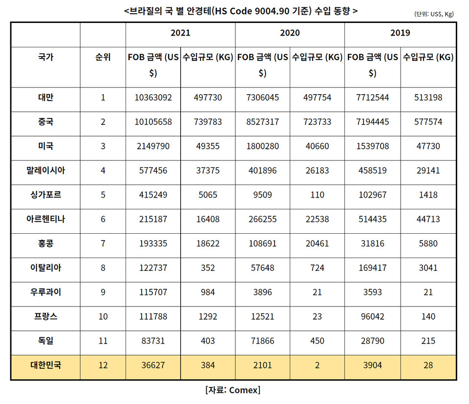브라질은 전통적으로 글로벌 안경기업들이 주도하고 있으며 소수의 기업만이 현지에서 안경을 생산하고 있다. 브라질 안경 수입은 2020년 기준 995만2000달러를 기록했으며 이는 전년보다 약 35% 감소했다. 브라질의 최대 안경 수입국인 중국으로 전체 시장의 약 39.9%를 차지한다. 이어 대만, 미국, 말레시이사, 아르헨티나로 조사됐으며 한국은 12위에 랭크돼 있다.