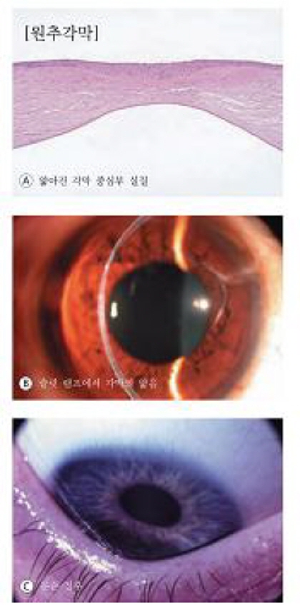 원추각막은 보통 양안에서 모두 발생한다. 원인은 불명확하며, hartstein처럼 하드 콘택트렌즈의 사용이 원추각막을 발달시킨다고 하는 주장도 있었지만 그것을 원인으로 봐야할 것인지 아니면 이미 진행 중이던 원추각막을 자극한 결과일 뿐인지가 명확하지 않다. 원추각막이 많이 진행되면 각막이 하안검과 맞닿으면서 드러나는 문슨 징후(munson's sign)를 직접 관찰할 수 있다.