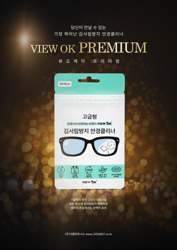 이번에 새롭게 출시된 '뷰ok 고급형(Premium)' 김서림 방지 안경크리너는 국내 판매되고 있는 모든 안경렌즈에 기능 발현과 지속시간 유지, 사용 횟수 테스트 등 10개월 동안 충분한 임상테스트를 거쳐 출시된 제품이다. 국내에서 12시간 이상 김서림 방지가 유지되는 최초의 제품으로 알려졌다.