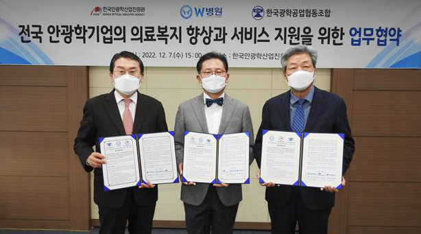 한국안광학산업진흥원(원장 진광식‧이하 진흥원)이 W병원(병원장 우상현), 한국광학공업협동조합(이사장 박영화)과 지난 7일 진흥원 회의실에서 업무협약을 체결했다.