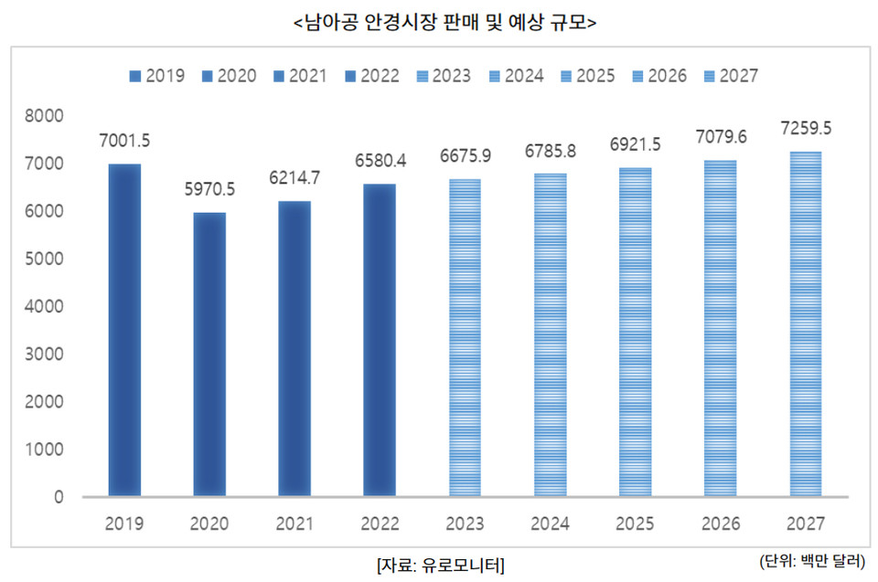 다행히 최근 코로나와 관련된 규제를 전면 해제하면서 안경시장도 조금씩 회복세를 보이고 있다. 물론 코로나 이전 시장 규모를 회복하지는 못하고 있지만 유로모니터는 2017~2022년까지의 시장 성장률은 -11.5%를 기록하고 있으나 2023년부터는 7%의 성장률을 기록할 것이며, 2027년까지 연평균 4.8%의 성장률을 기록할 것이라고 전망했다.