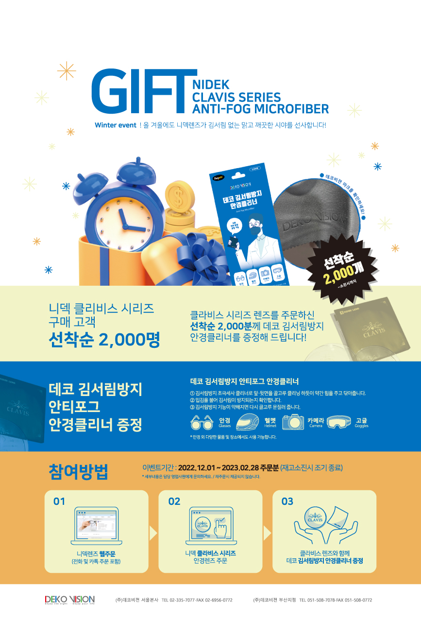 데코비젼(대표 주해돈)이 실내외 온도차로 인해 안경에 김서림이 방지하는 겨울철에 맞춰 안경클리너를 증정하는 이벤트를 이달 말까지 진행하고 있다. 데코비젼은 니덱렌즈 최고급 프리미엄 누진 라인인 '클라비스' 시리즈를 구매할 경우 안티포그 클리너를 제공, 고객 확보를 통한 안경원 비즈니스 향상을 위해 이벤트를 진행 중이다.