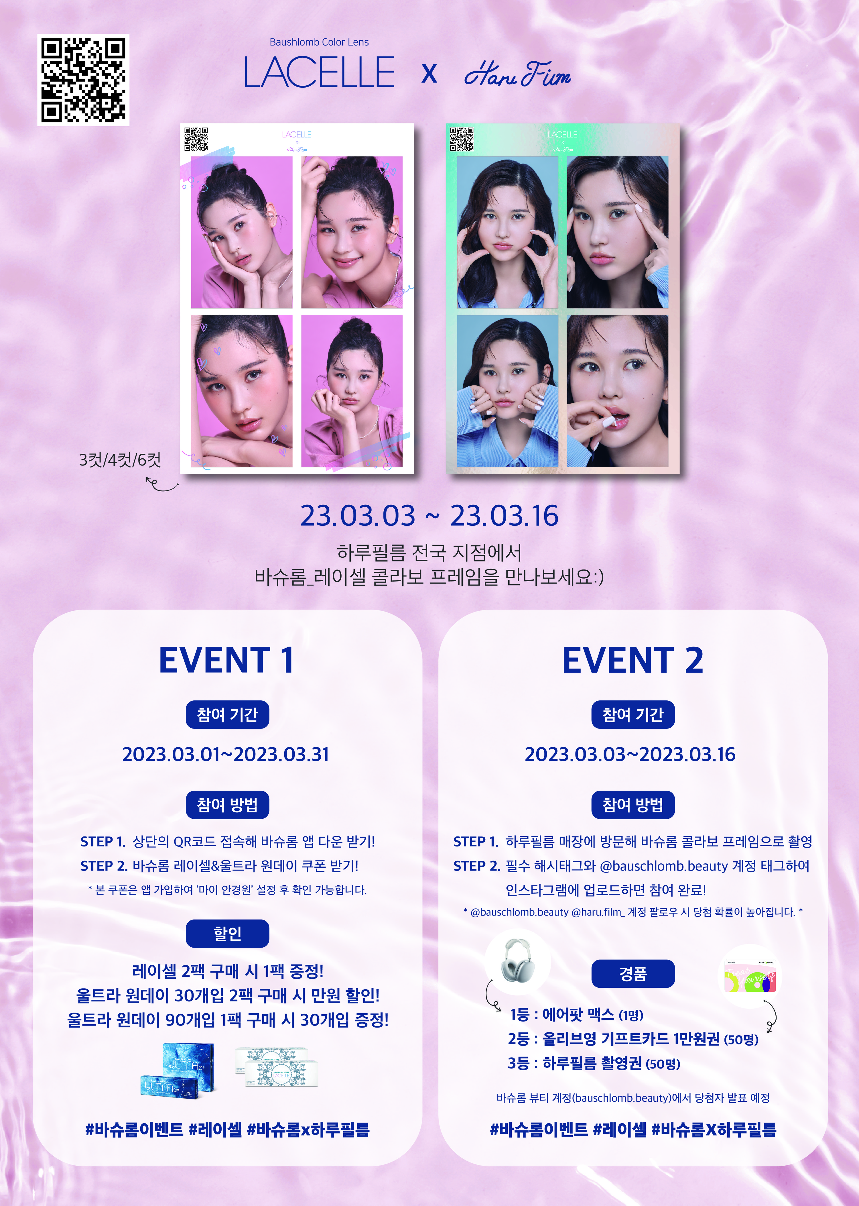 해당 이벤트는 이달 3일부터 16일 목요일까지 2주간 진행된다. 하루필름 전국 116개 매장에서 레이셀 포토 프레임과 레이셀 포스터를 만나볼 수 있음은 물론 서울 홍대입구역 2호점, 강남점, 부산 광안대교점에서는 특별한 레이셀 포토부스도 설치된다. 참여 기간 동안 하루필름 매장에 방문해 바슈롬 콜라보 프레임으로 촬영 후 필수 해시태그와 함께 @bauschlomb.beauty 계정을 태그하면 경품 이벤트에 참여할 수 있다. 당첨 발표는 3월 말 경 바슈롬 뷰티 인스타 계정에서 공개될 예정이다.