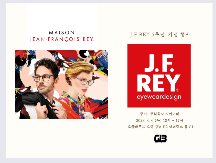 한편 제이에프레이는 프랑스 대표 하우스 아이웨어 브랜드로 디자이너 장 프랑스와 레이와 그의 아내 죠엘이 젊은 디자이너들과 함께 혁신적이고 전위적인 스타일은 물론 독창적인 컬러감으로 최고 품질의 아이웨어 컬렉션을 만들어 내고 있다. 국내에는 지난 2019년부터 지아이비가 새로운 디스트리뷰터로 나서며 안정적이고 신뢰감 있는 영업정책을 바탕으로 안경사들의 큰 사랑을 받고 있다.