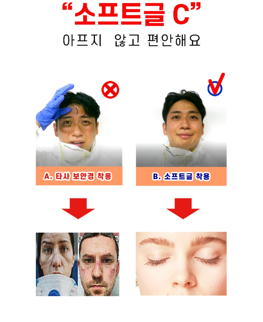 기존 시장에 판매되고 있는 고글 타입 중 실리콘으로 제작된 제품은 얼굴 근육이 조금만 움직여도 통증이 느껴진다. 타사 고글과 소프트글 보안경을 점토에 같은 압력을 가해 테스트 해보면 소프트글 보안경은 자국이 남지 않는다. 현장에서 고글을 장시간 착용하면 고글 때문에 얼굴에 상처가 나기도 하고, 방역 관련 의료진들 역시 하루종일 고글 보안경 착용하면 아프고 찍히고 해서 눈밑과 이마에 밴드를 붙이고 사용하는 모습을 종종 확인할 수 있다. 그래서 타사 제품들은 실리콘 함량을 높여 조금이라도 무르게 만드는 것에 초점을 두지만, 소프트글 보안경은 아예 피부에 접촉되는 부분에 쿠션 소재를 덧대어 차별화를 시도했다.