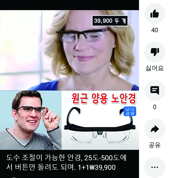 제품 판매에 열을 올리고 있는 상황이다. 모 유튜브 채널에서는 소비자들에게 사랑받은 근용안경 및 돋보기 순위를 매기고, 1위부터 10위를 차지한 근용안경 제품에 대한 설명, 동영상 아래 댓글 창에 제품을 구입 할 수 있는 구입처 링크 주소를 친절하게 올려놓고 소비자들에게 판매 중이었다. 실제 해당 채널에는 유튜브 플랫폼으로 돋보기를 판매하는 업체 중 월 판매량이 무려 10만개 이상 되는 업체도 있음이 확인됐다. 유튜브를 통한 돋보기 판매가 지속적으로 이어지자 일선 안경사들은 대안협에 시급히 시정 조치해 줄 것을 요구한 것으로 알려졌다. 대안협 역시 법무팀을 중심으로 모니터링 하면서 유튜브를 통한 근용안경 판매에 대응을 하고 있다.
