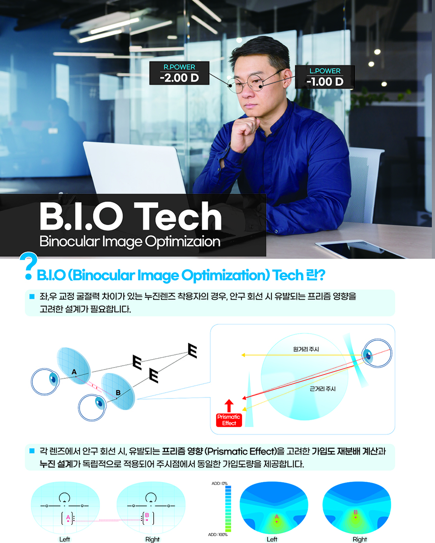 양안 망막상 최적화 기술(B.I.O Tech)은 각 렌즈에서 안구 회선 시, 유발되는 프리즘 영향을 고려한 누진설계를 독립적으로 적용해 시선의 위치에 따라 가입도를 재분배하고 조정해 편안한 중·근거리 시야를 제공하는 것이 특징이다.