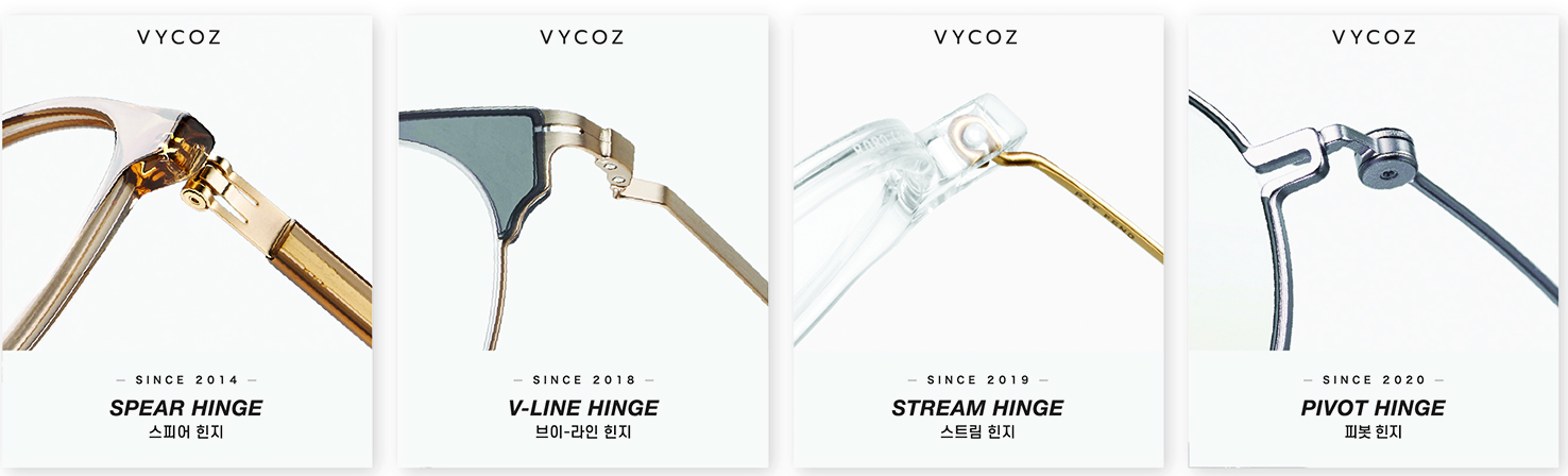 스트림 힌지(STREAM HINGE)는 2019년 독자적인 기술로 설계됐다. 유려하게 흐르는 물길 같은 실루엣이 시각적으로 편안함을 느끼게 한다. 또한 수 많은 템플 폴딩에도 절대 빠지지 않는 핀은 VYCOZ만의 노하우로 완성시킨 결정체라고 할 수 있다. ECO WIRE가 대표 컬렉션이다.