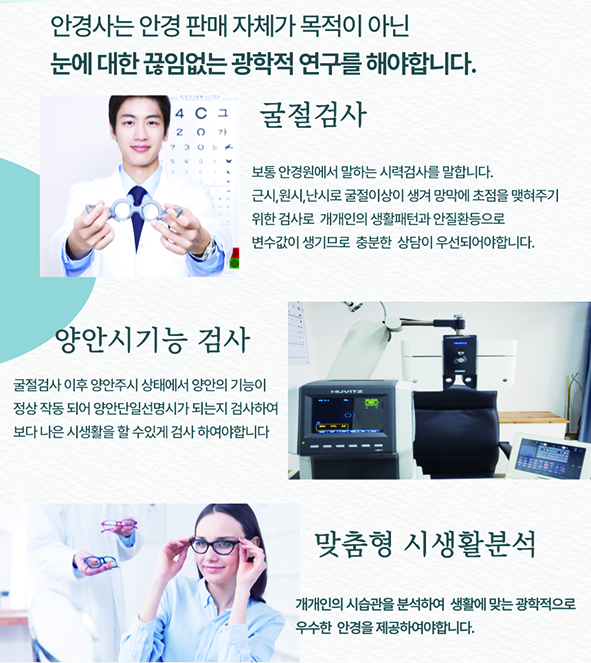 실제 현장에서 만난 안경사들도 안경사가 되더라도 많은 공부와 많은 임상 사례를 접해야 한다고 입을 모았다. 안경 판매 자체가 목적이 아니라 눈에 대한 끊임없는 광학적 연구를 해야 한다는 것이다. 결국 기본적인 굴점검사에서 양안시 기능 검사, 이후 맞춤형 시생활 분석을 통해 우수한 안경을 소비자들에게 전달해야 진정한 전문가로서 자부심을 느낄 수 있다.