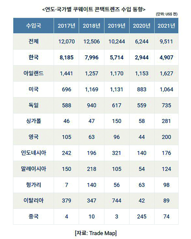 눈에 띄는 점은 쿠웨이트 콘택트렌즈 1위 수입국은 한국이라는 점이다. 쿠웨이트는 전체 수입량의 50% 이상을 한국으로부터 수입하고 있으며 품질, 디자인, 착용감 측면에서 한국 콘택트렌즈 인기가 높다. 2위 수입국은 아일랜드이며 미국, 독일이 그 뒤를 잇는다.