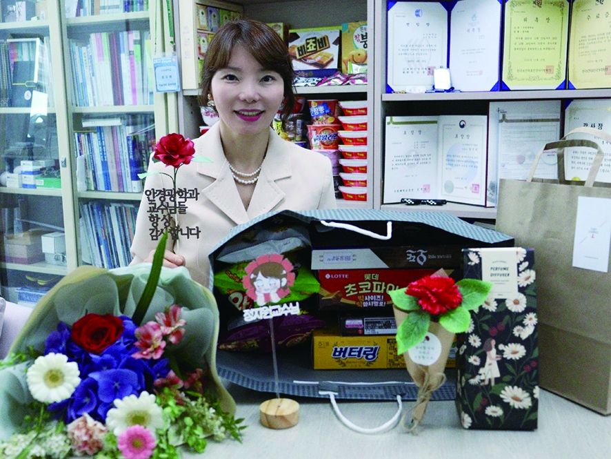 정 교수는 학생들의 작은 성의가 오히려 고마움으로 다가온다고 전했다. 정 교수는 “과자, 라면 등으로 학생들과 소통을 하기시작했다. 수업이 끝나고 쉬는 시간이면 안경광학과 학생 누구나 교수 연구실을 이용하기 때문에 저와 학생들 사이 눈에 보이지 않는 벽은 사라진 것 같다”고 했다. 스승의 날 대표로 정 교수 연구실에 먹거리를 채운 손하은·남준영 학생은 “평소 교수님 연구실은 과 학생들 모두가 편하게 드나들 수 있는 공간이었다. 과자, 라면, 음료수 등을 마음껏 먹을 수 있어 편한 곳이다.
