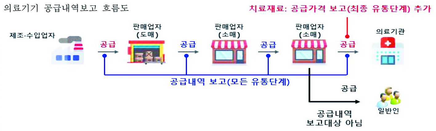 식품의약품안전처는 지난 2020년부터 의료기기 유통구조의 투명성 및 위해 제품 추적성을 높이기 위해 제조 수입 유통 단계별 의료기기 공급내역 보고를 의무화한 ‘의료기기 공급내역 보고 제도’를 시행하고 있다.