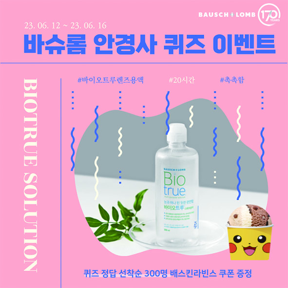 이번에 진행되는 퀴즈 이벤트 주제는 바슈롬 프리미엄 소프트렌즈 다목적관리용액인 바이오트루다. 렌즈를 20시간 촉촉하게 도와주는 바이오트루 용액에 함유된 천연 성분에 대한 퀴즈를 진행하며, 퀴즈 정답자 선착순 300명에게는 배스킨라빈스 싱글레귤러 모바일 쿠폰을 증정할 예정이다. 정답 힌트는 퀴즈 이벤트 진행일 발송되는 알림톡 영상 속에서 확인할 수 있다.