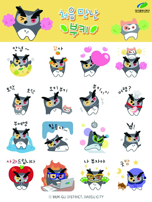 대구광역시 북구가 오는 12일 오후 2시부터 카카오톡 채널을 통해 북구 캐릭터 ‘부키’ 이모티콘을 3만명에게 무료 배포한다.부키(BOOKEY)는 북구의 구조(區鳥) 수리부엉이를 형상화한 캐릭터로 안경산업특구의 상징성을 살린 대표 새의 모습을 상징한다. 수리부엉이의 ‘ㅂ’과 북구의 ‘ㅂ’의 초성을 인용해 친근하고 부르기 쉽게 이름을 지은 것이다. ‘부키’ 이모티콘은 16종으로 구성돼 있으며 카카오톡을 실행한 뒤 검색창에 ‘대구 북구청’을 입력해 북구 공식 카카오톡 채널을 추가하면 다운로드 할 수 있다