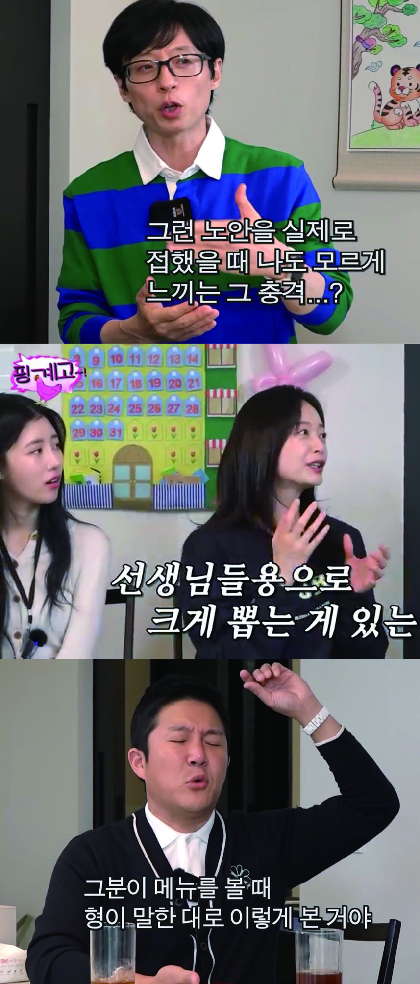 특히 조세호는 “평소 시력이 좋은 편이라고 자부했는데 얼마 전 핸드폰을 볼 때 나도 모르게 화면을 좀 멀리 떨어져서 보게되더라”고 말하자 전소민 역시 “나도, 나도”라며 동감했다. 유재석은 “노안을 실제로 접했을때 충격이 컸다. 핸드폰을 보다가 잘 보이지 않아 안경을 위로 들어올리고 보는 모습 등이 나타날때 깜짝 놀란다”고 말했다. 조세호도 이에 공감하면서 “정말 관리 잘하시고 잘 꾸미고 다니는 분이 있는데 원래 나이보다 훨씬 젊어보인다고 생각했다. 그러다 메뉴판을 보면서 안경을 들어 올리더라. 그런 모습을 보면 나이를 속이지 못하는 것 같다”고 공감했다. 전소민도 “촬영장에 가면 스케줄 표를 출력해서 주는데 연로하신 연기자 선배님들을 위해 포인트를 크게 해서 뽑은 종이를 따로 준다. 그 종이로 보면 나도 훨씬 편하지만 괜히 더 오기로 안보게 된다”고 덧붙였다.