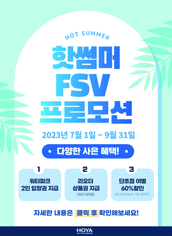㈜한국호야렌즈(대표 정병헌)가 본격적인 여름 시즌을 맞아 7월 초부터 오는 9월 말까지 안경사 대상 ‘HOT SUMMER’ 프로모션을 진행한다.‘워터파크로 더운 여름 날려버리자!’라는 메시지를 안경사에게 알리는 이번 프로모션은 호야 단초점 여벌렌즈 리오더에 따른 워터파크 입장권과 상품권 제공에 60% 할인까지 총 3가지 혜택으로 구성된 파격적인 프로모션이다.
