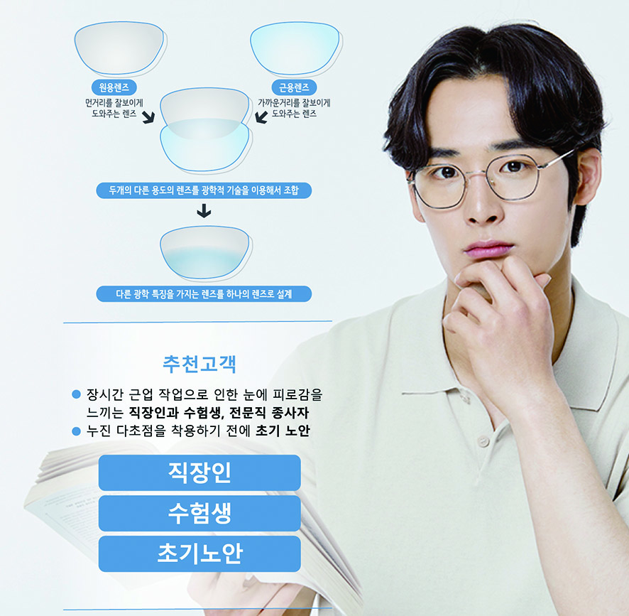 니덱 아이티 추천 고객으로는 장시간 근업 작업을 많이 하며, 그로 인해 눈에 피로감을 느끼는 고객, 누진 다초점 착용 전 적응이 필요한 초기 노안 고객들에게 적합하다. 또 공부, 독서, 스마트기기 사용이 많은 수험생이나 컴퓨터 및 스마트 기기 사용이 많은 직장인, 근거리 작업이 많은 전문직 종사자에게 강력 추천할 만하다.