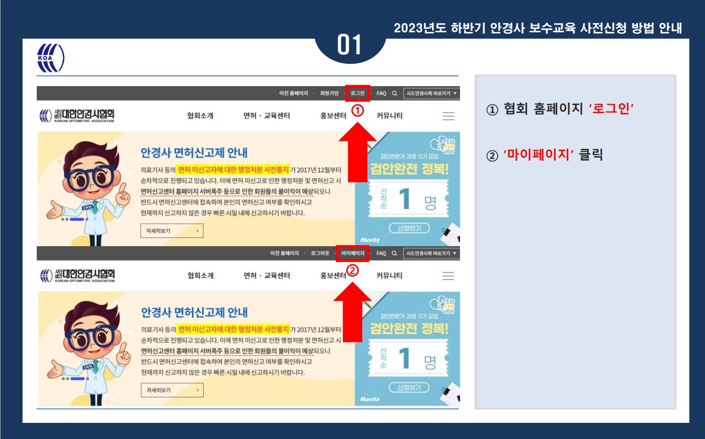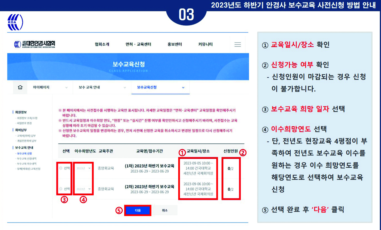 2023년 하반기 안경사 보수교육이 9월 총 2회 오프라인 대면 교육으로 진행된다. 9월 5일과 6일 오전 10시부터 오후 2시까지 총 2차에 걸쳐 건국대학교 새천년관 국제회의장에서 치러질 전망이다.