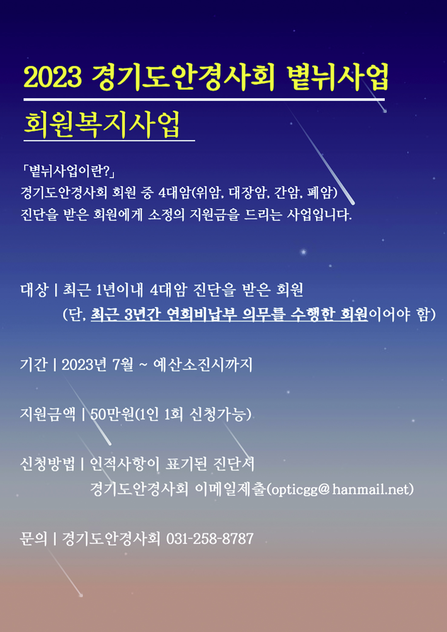 신청방법은 인적사항이 표기된 진단서를 경기도안경사회 공식 이메일(opticgg@hanmail.net)로 제출하면 된다. 자세한 문의는 경기도안경사회 사무국(031-258-8787)으로 하면 된다.