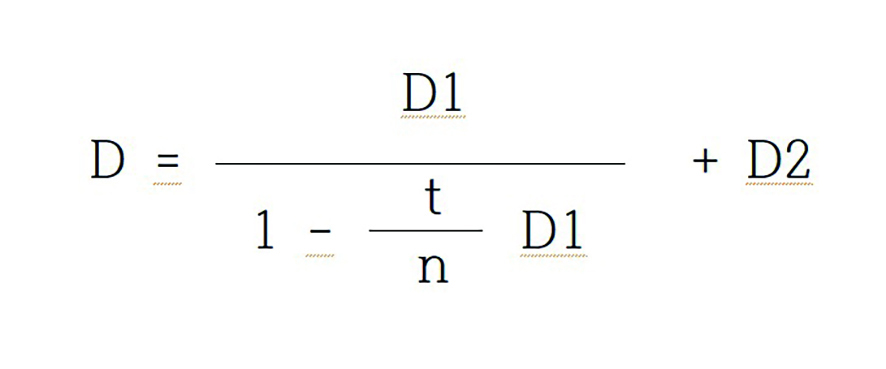 실제로 시험렌즈만 하더라도 고도수의 렌즈들을 겹쳐서 시험테에 장입하고 렌즈미터로 측정을 해보아도 우리가 흔히 알고 있는 1번 렌즈와 2번 렌즈의 합성굴절력 D의 굴절력 D=D1+D2가 적용되지 않는다.