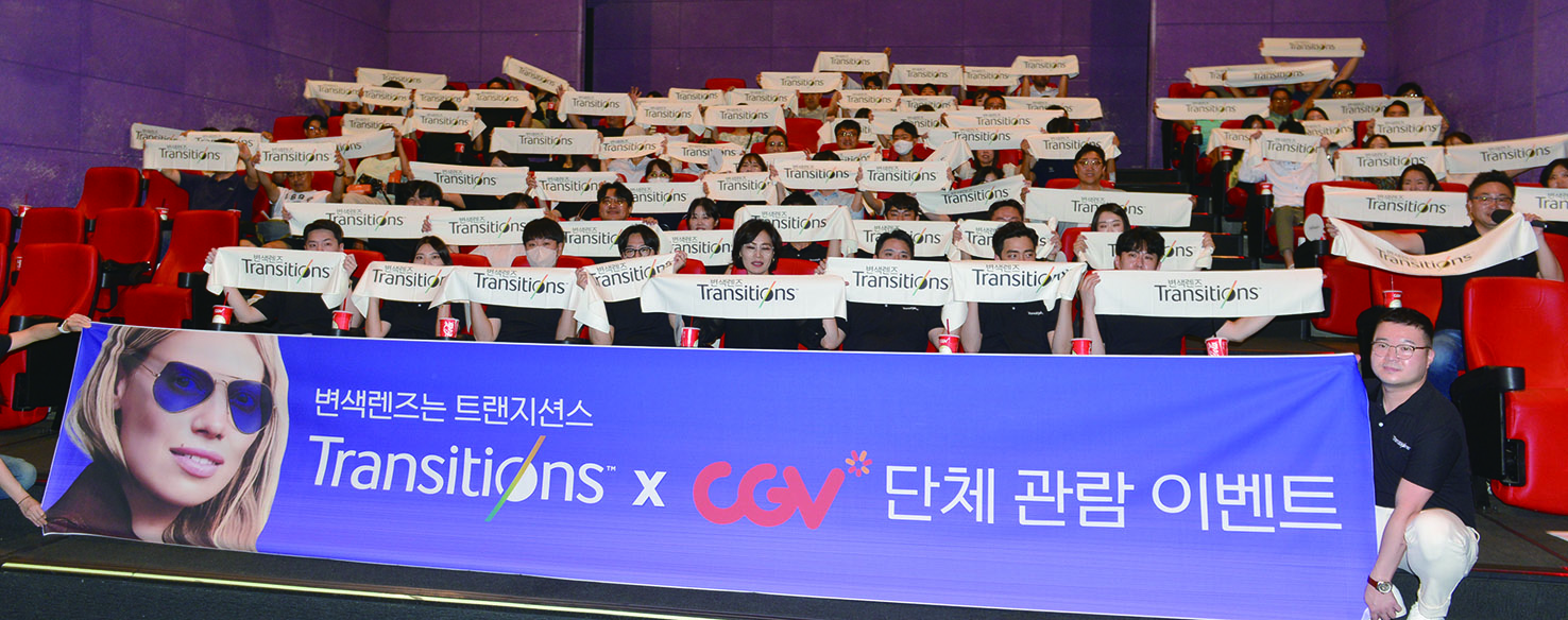 전세계 변색렌즈 시장 점유율 1위 브랜드인 트랜지션스를 전개하는 에실로코리아(대표 소효순)가 지난달 28일 CGV 왕십리점에서 안경사를 초청해 시사회 등 다양한 이벤트를 진행했다. 이번 행사는 트랜지션스의 다양한 소비자 홍보 활동들을 안경사들에게 공유하고 영화관 광고를 기념하기 위해 트랜지션스 광고 시사회도 함께 열었다. 참석한 안경사들은 트랜지션스 부스 체험은 물론 최신 인기영화인 ‘밀수’를 관람했다.