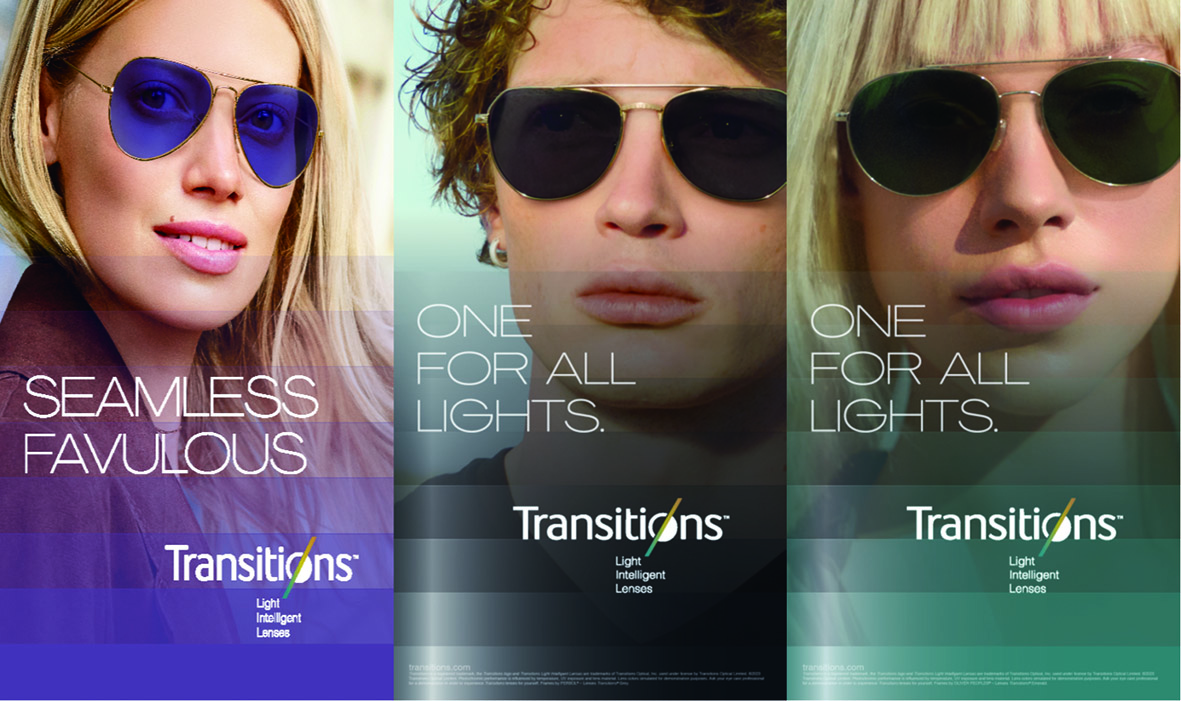 트랜지션스는 전 세계 변색렌즈 시장 점유율 1위의 변색렌즈 브랜드다. 자외선과 블루라이트로부터 눈을 보호해주는 기능이 있다. 또한 국내 출시된 변색렌즈 브랜드 중 가장 다양한 컬러 라인업을 보유하고 있어서 기능적인 면뿐만 아니라 트랜디한 패션아이템으로도 손색이 없다. 여름철 필수 아이템이며 소비자 인지도 홍보를 적극적으로 펼치고 있는 변색렌즈 선두 브랜드이다.