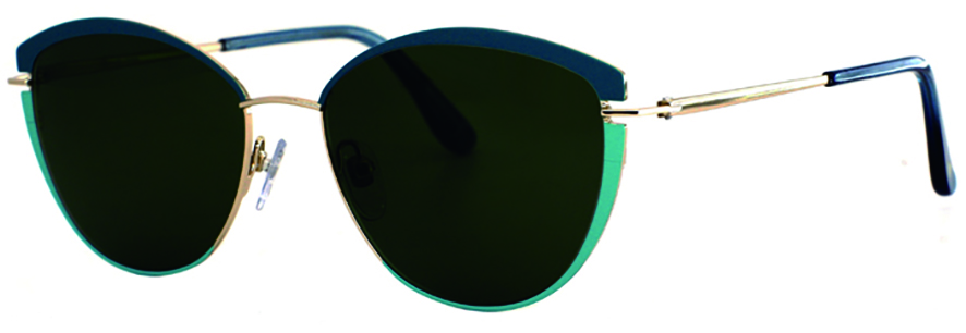 바르톨리 마담용 선글라스다. 렌즈는 Dark Green, G-15 렌즈를 사용했으며, 컬러는 블루&청록, 라이트 골드 베이스다. 소재는 스테인레스 스틸, 아세테이트를 사용했으며, 내면 AR 코팅 CR-39 렌즈다.