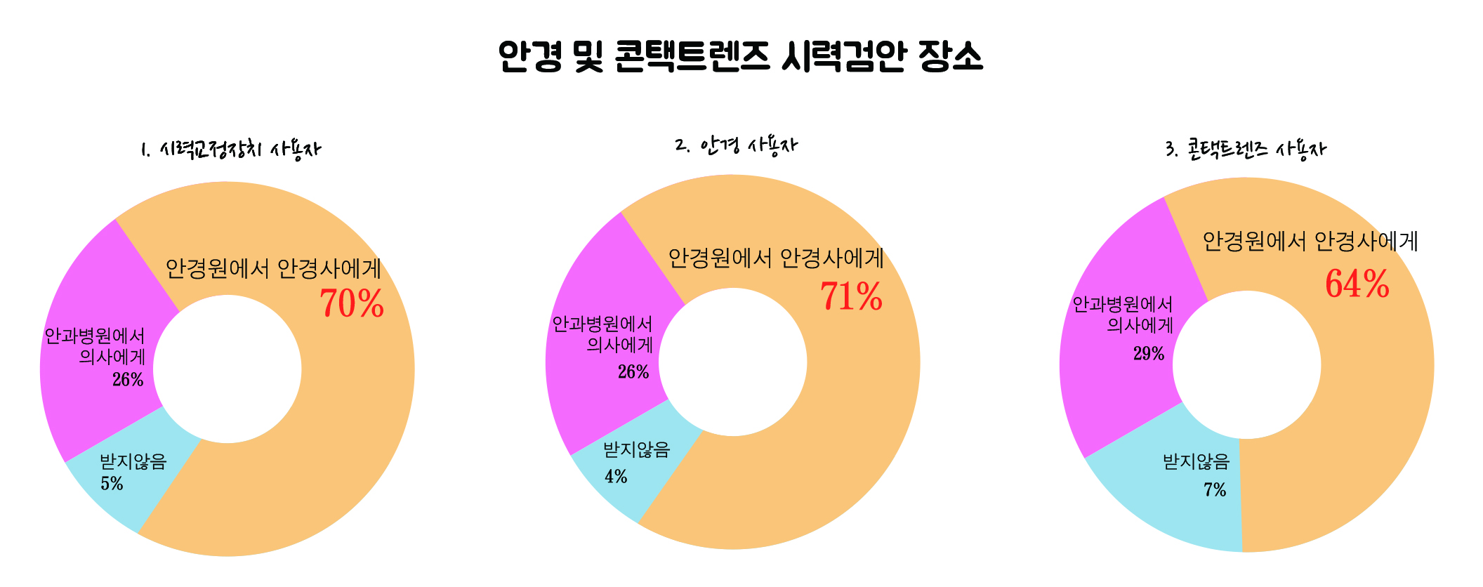 ‘안경원에서 안경사에게 시력 검안을 받는다’고 답한 응답자는 안경 사용자가 71%, 안경과 콘택트렌즈 동시 사용 응답자는 70%, 콘택트렌즈만 사용하는 응답자는 64%로 ‘안과에서 받는다’고 답한 응답자보다 훨씬 많았다. 이는 안경원이 얼마나 국민들에게 친숙한 장소로 인식되고 있는지 잘 나타내주는 결과로 보여진다.