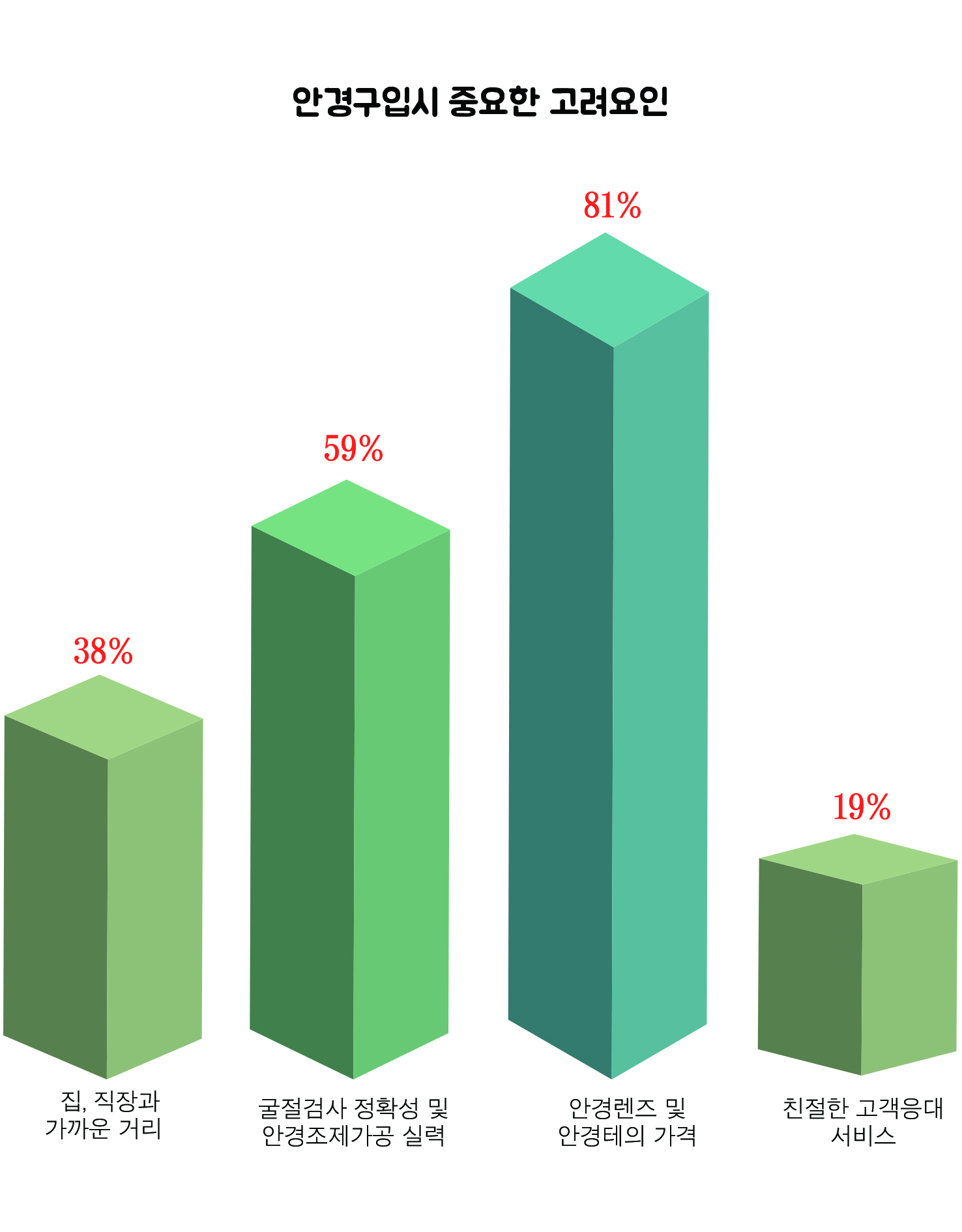 안경구입 시 가장 중요하게 고려하는 요인으로는 무려 81%의 응답자가 ‘안경렌즈 및 안경테의 가격’이라고 답했다. ‘굴절검사 정확성 및 안경 조제 가공 실력’이라고 답한 응답자도 59%에 달했다. ‘집이나 직장 등 가까운 거리’, ‘친절한 고객 응대 및 서비스’는 각각 38%와 19%로 나타났다.