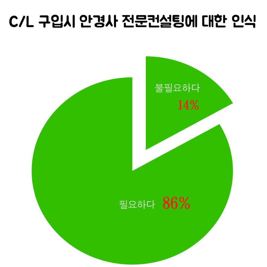 콘택트렌즈 구입 시 10명 중 8명 이상은 ‘안경사의 전문 컨설팅이 필요하다’고 답했다. 특히 연령대가 높을수록 전문 컨설팅과 상담이 필요하다고 응답한 경우가 많은 것으로 나타났다. 콘택트렌즈를 사용하는 337명의 응답자 중 50대 이상이 108명으로 가장 많았는데 무려 90.7%가 필요하다고 응답했다. 20대는 79.3%가 필요하다고 답해 50대나 40대(89.4%)에 비해 크게 낮았다. 이는 20~30대 젊은 고객층의 경우 자신의 도수를 잘 알고 있을뿐더러 미용이나 패션 목적의 컬러 콘택트렌즈를 주로 구매하기 때문에 고연령층에 비해 안경사의 전문적인 컨설팅에 대해 중요하게 생각하고 있지 않은 것으로 보인다.
