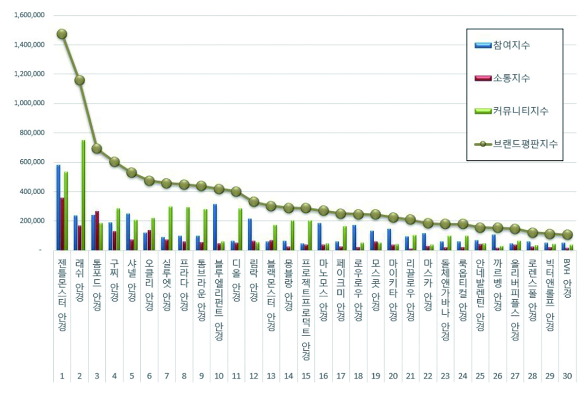 2023년 9월 안경 브랜드 평판 30위까지를 살펴보면 1위 젠틀몬스터를 시작으로 래쉬, 톰포드, 구찌, 샤넬, 오클리, 실루엣, 프라다, 톰브라운, 블루엘리펀트, 디올, 림락, 블랙몬스터, 몽블랑, 프로젝트프로덕트, 마노모스, 페이크미, 로우로우, 모스콧, 마이키타, 리끌로우, 마스카, 돌체앤가바나, 룩옵티컬, 안네발렌틴, 까르벵, 올리버피플스, 로렌스폴, 빅터앤롤프, BVH 안경 순이었다.