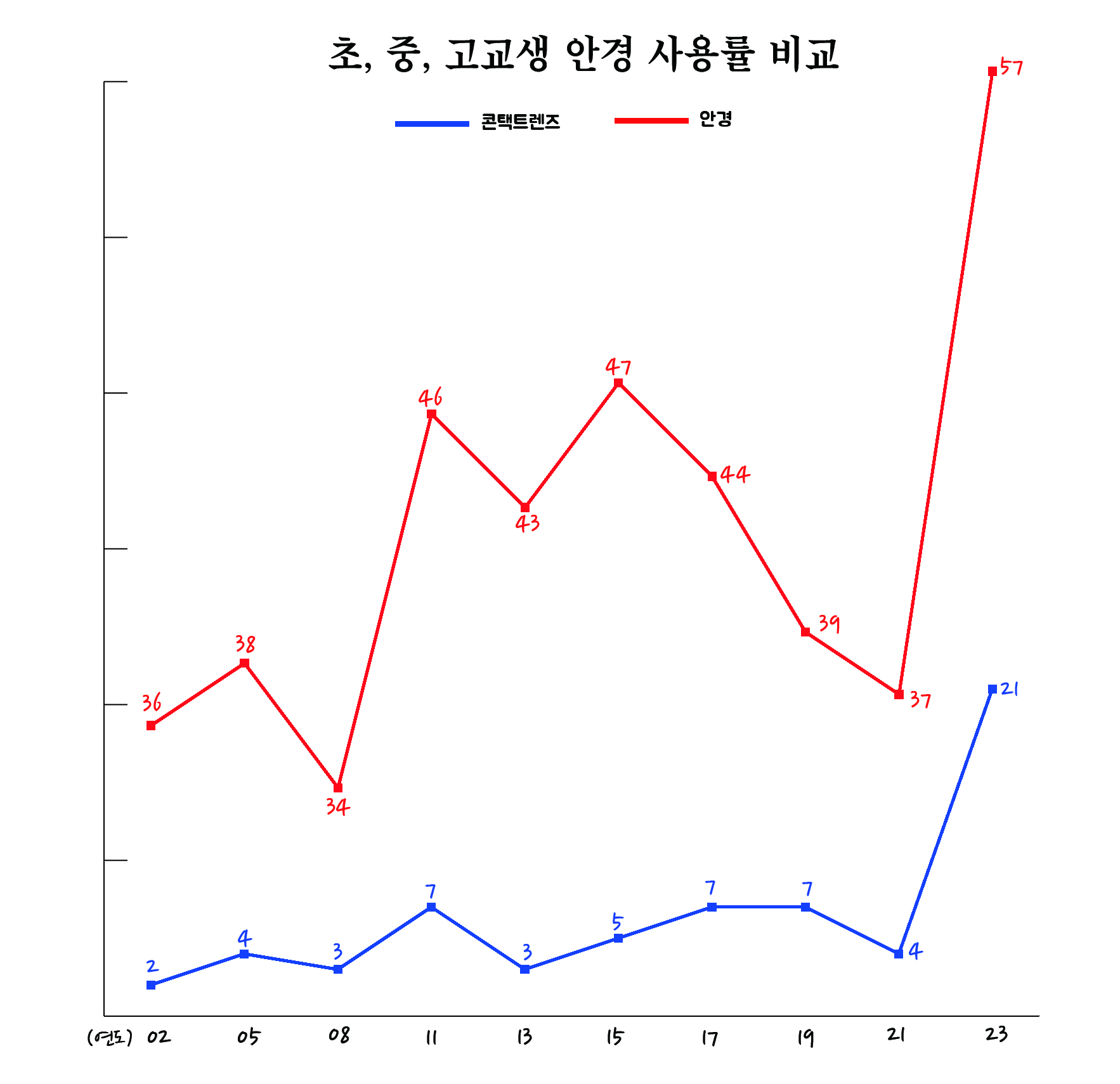2023년 현재 전국 초‧중‧고교생 안경 사용률은 57%, 콘택트렌즈 착용률은 21%로 각각 조사됐다. 안경 사용률은 지난 2021년 조사 당시 37%보다 20% 가량 증가한 수치로 청소년들의 안경사용률이 2년 사이에 크게 증가한 것으로 나타났다. 콘택트렌즈 사용률 역시 2021년 4%에서 21%로 증가해 17% 이상 늘었다. 가장 큰 원인으로는 코로나 팬데믹 상황에 따른 화상 수업 증가로 인한 디지털 기기 사용량이 크게 늘어났기 때문인 것으로 보여진다.