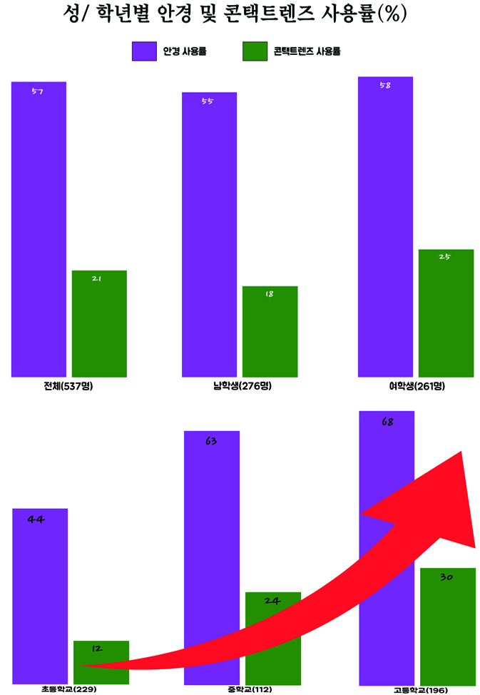 시력 교정장치 사용률은 고학년일수록 사용률이 증가하는 것으로 나타났으며, 남학생 대비 여학생들의 사용률이 상대적으로 높았다. 남학생 안경사용률은 55%, 여학생은 58%였으며, 콘택트렌즈 사용률도 남학생이 18%, 여학생이 25%로 나타났다. 학년별로는 초등학생 안경사용률이 44%, 콘택트렌즈 사용률이 12%로 조사됐으며, 중학생 안경 사용률이 63%, 콘택트렌즈 사용률이 24%였다. 고등학생 안경사용률은 68%, 콘택트렌즈 사용률은 30%로 나타났다.