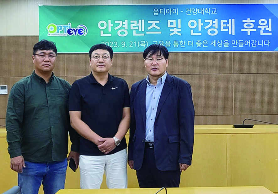 지난달 21일 건양대 메디컬캠퍼스에서 열린 후원식에는 옵티아이 김판준 대표, 건양대 안경광학과 정주현 교수, 드림광학 박정진 대표가 참석했다.