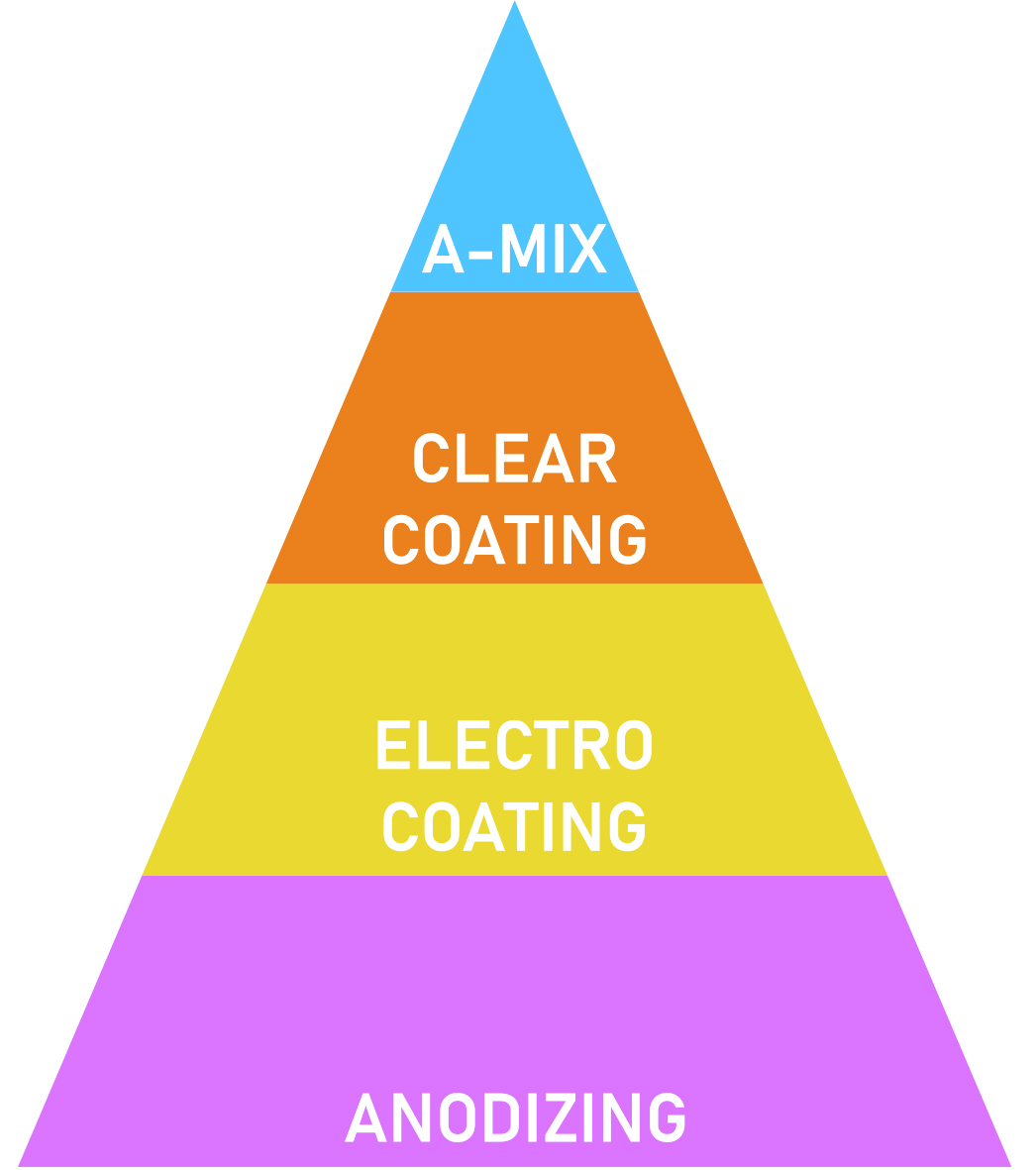 2024년도 제니에스 신모델에 적용되는 3중 믹스 컬러구현 기법은 1차 아노다이징(anodizing), 2차 일렉트로코팅(electrocoating), 3차 클리어코팅(clearcoating)으로 이뤄진 제니에스만의 컬러기법이다. 기존 착색기법을 뛰어넘는 제니에스의 3중 믹스 컬러기법은 자체 개발한 다중 믹스 컬러 구현으로 새로운 친환경 착색 기술의 시작을 알리고 있다.