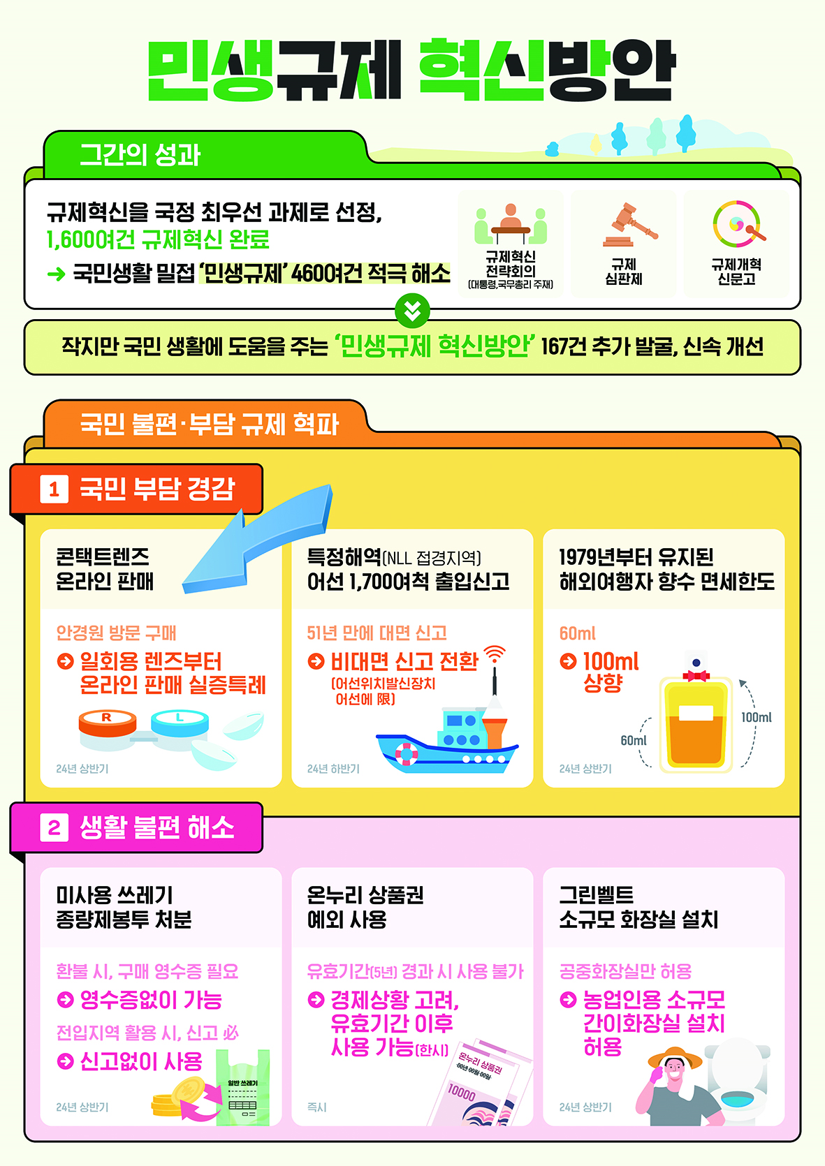 정부는 지난 22일 개최된 제31차 국정현안관계 장관회의(주재 국무총리)에서 국민의 불편을 해소하고 민생경제를 활성화하기 위한 ‘민생규제 혁신방안’을 발표했다. 이 자리에서 일상생활 속 불편함을 초래하는 규제들을 대거 손보기로 하며, 총 167건의 규제 개선사항을 담은 ‘민생규제 혁신방안’을 발표했다.