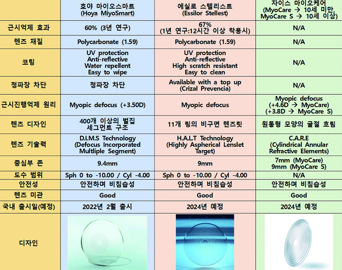 국내에서는 2022년 2월 호야렌즈에서 ‘마이오스마트 (MiyoSmart)’를 출시했습니다. 마이오스마트 (MiyoSmart)는 국내 출시 3~4년 전부터 이미 해외에서부터 출시가 되었으며, 근시 관련 전문가 글로벌 커뮤니티 그룹에서 근시억제 효과에 대해 만족할 만한 제품으로 인정받고 있습니다. 그 이후 여러 글로벌 회사에서도 근시진행억제 렌즈 개발 및 임상연구를 실시한 결과 ‘에실로 스텔리스트 (Stelletst)’와 ‘자이스 마이오케어 (MyoCare)’가 2024년에 국내 출시될 예정이라고 합니다.