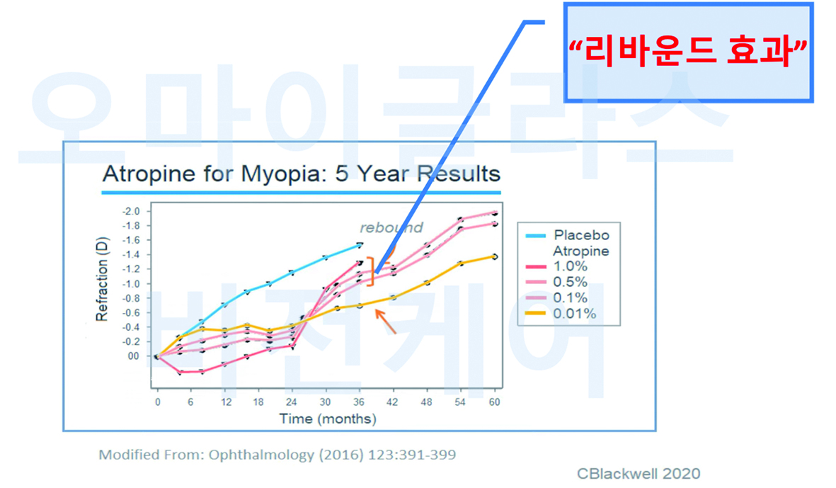 따라서 리바운드 효과가 없는 ‘저농도 (0.01%) 아트로핀’ 이 더 효과적이라는 연구 결과들이 있었으나, 2023년 7월13일 미국의사협회 안과학회지(JAMA Ophthalmology)에 발표된 최신 연구논문에 의하면 “저농도 아트로핀이 근시진행억제에 별로 도움이 되지 않는다”라는 결과가 발표되었습니다.