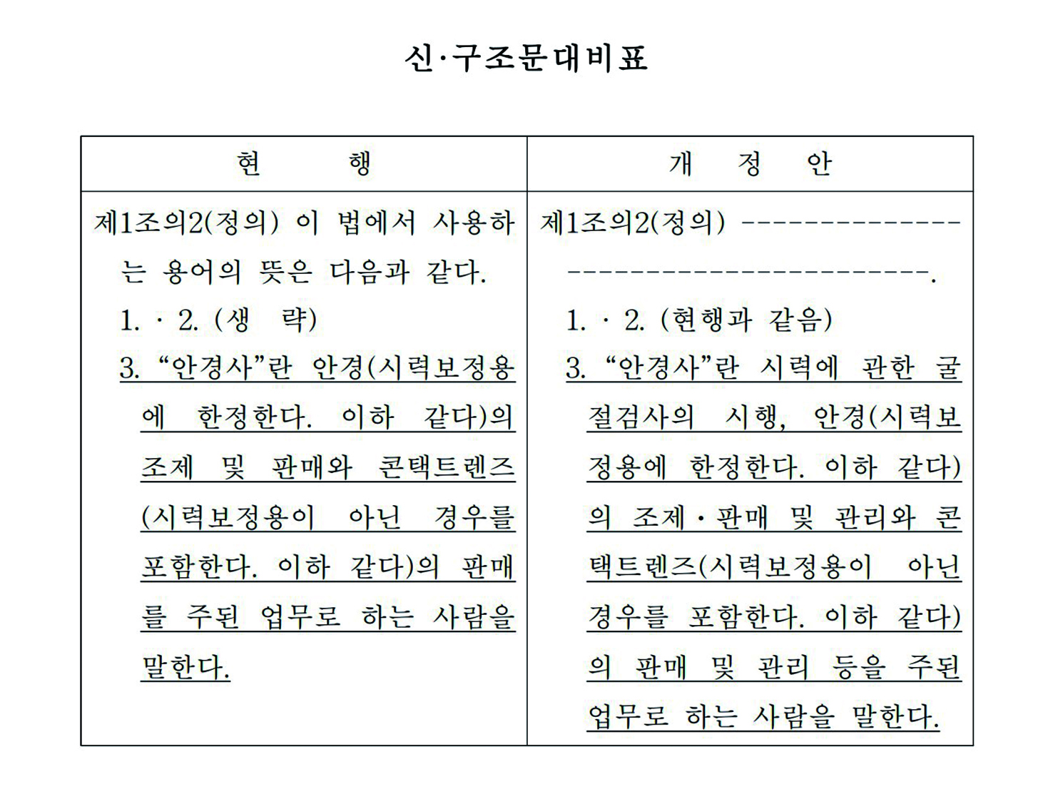 안경사 업무범위에 ‘굴절검사’가 명시되고 안경과 콘택트렌즈 조제·판매에 ‘관리’ 업무까지 포함된 ‘의료기사 등에 관한 법률 일부개정법률안’이 올해 9월 12일 국회 본회의에 접수됐다. 더불어민주당 정춘숙 의원이 대표 발의한 이 법안은 현재 국회 소관위 회의를 거치며 본회의 상정을 기다리고 있다. 법안을 살펴보면 안경사 정의 부분에 안경사 업무범위를 굴절검사와 안경‧콘택트렌즈의 관리까지 확대, 규정해 안경사 역할을 명확히 했다.