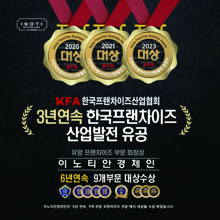 한편, 이노티안경체인은 업계 20여년의 노하우를 바탕으로 프랜차이즈산업 기술력을 갖추었을뿐만 아니라, 전문적인 안경사 교육, PB상품개발, 아이케어 컨설턴트 배출 등 엄격한 운영관리 시스템을 설정하고 있다. 또 표준화된 안경원 운영시스템을 유지하고 향상시키기 위해 끊임없이 연구하면서 더 나은 서비스를 제공하고 있어 이번에 수많은 브랜드 중에서 선택을 받을 수 있었다.