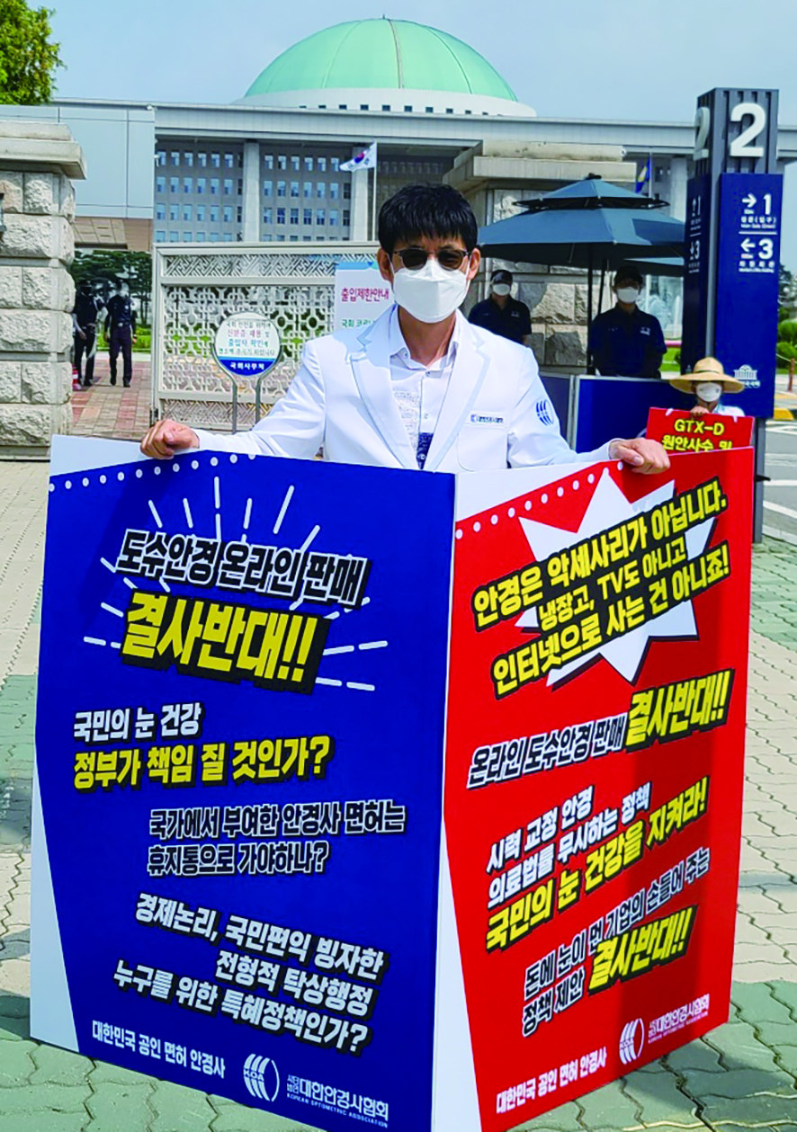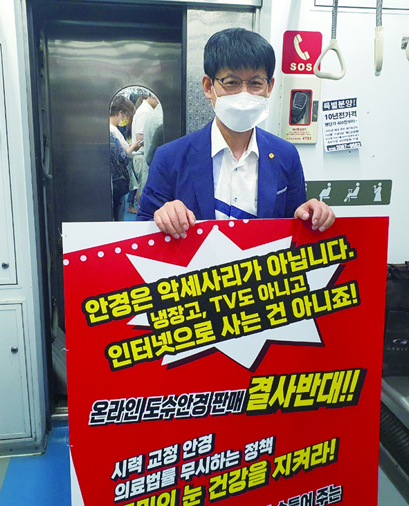 코로나19가 한창이던 상황에서 경기도안경사회 회장에 당선됐다. 본격적인 회무를 시작하려 할 때 정부의 도수 안경 온라인 판매 정책이 추진되면서 안경업계는 발칵 뒤집혔다. 안경사들은 반대 집회를 이어가고 최병갑 회장 역시 서울과 경기를 오가며, 온라인 판매 저지 1일 시위를 이어갔다. 무려 1달 가까이 국회와 청와대 그리고 세종시, 지하철, 이스트소프트 본사 앞에서 시민들을 만났다. 또 경기도 59명 국회의원들에게 온라인 판매 저지 탄원서를 보내고 직접 찾아가 면담을 진행하며 안경사들의 업권수호 의지를 보여줬다.