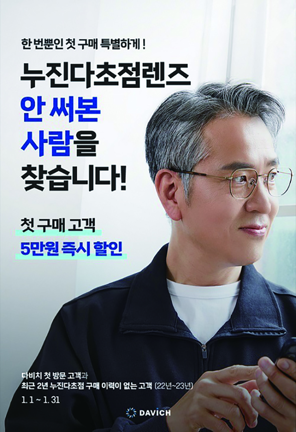 해당 프로모션은 1월 한 달 간 진행되며, 다비치안경을 첫 방문한 고객이거나 최근 2년동안 누진다초점렌즈를 구매한 적 없는 고객이 10만원 이상의 프로모션 제품을 선택했을 때, 현장에서 5만원을 즉시 할인 받을 수 있다.