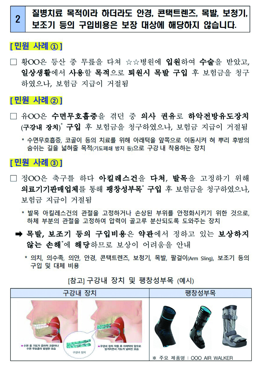 금감원은 “환자의 약해진 신체기능을 단순히 보조‧보완할 목적으로 사용되는 보조기 등의 구입비용은 보장 대상에 해당하지 않는다”고 했다. 또한 “질병치료 목적이 아닌 외모개선 목적의 수술 등은 보장 대상에 해당하지 않는다”고 덧붙였다.