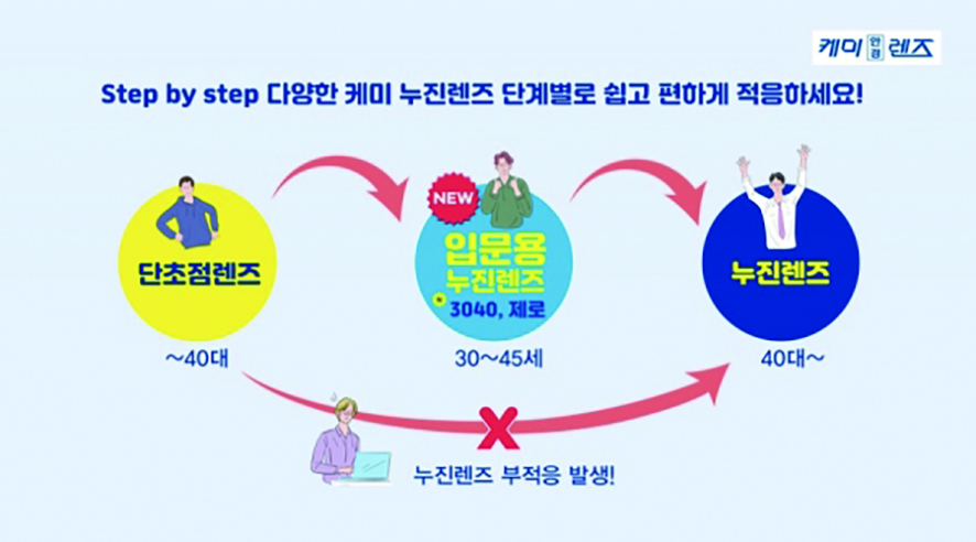 케미렌즈 관계자는 “근거리 시야 불편감을 처음 느끼는 3040 연령층의 경우 입문용 누진렌즈에 적응을 하다가 40대 후반 50대를 접어들면서, 본격적인 안구 조절 힘 부족이 많이 발생하면 ‘케미매직폼’ 누진렌즈 시리즈 등의 일반 누진렌즈로 바꿔 자연스럽게 누진 안경에 대한 적응을 할 수 있다”고 말했다.